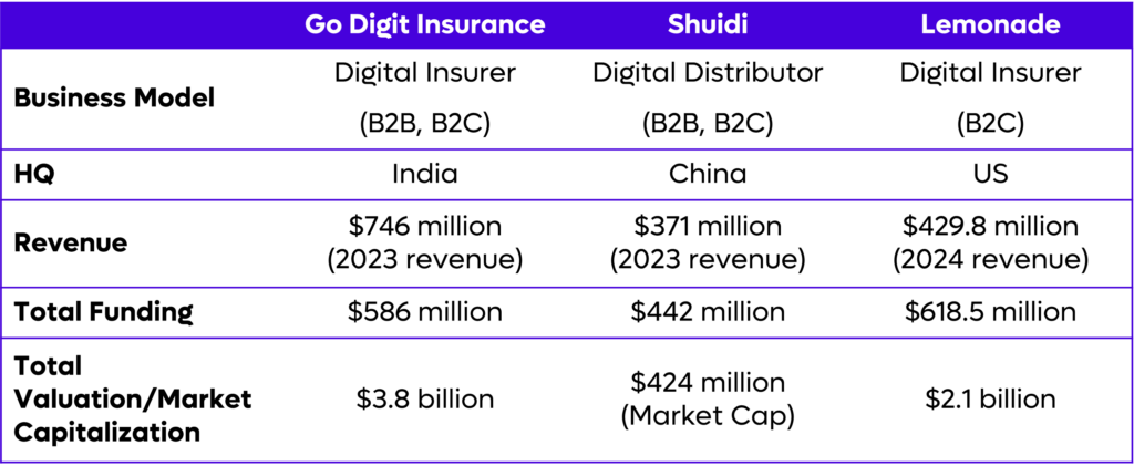 Fig 3 shows a side-by-side comparison of 3 high-potential Insurtech business models, selected based on total funding, valuation, and emerging market precedents.